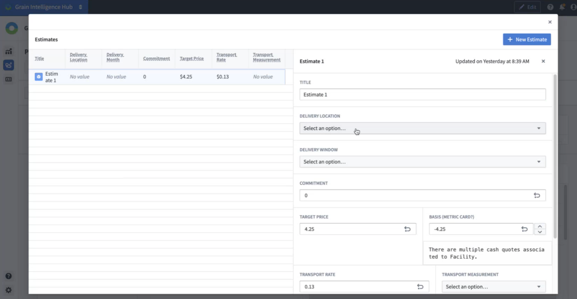 On the next page you can begin the process of strategizing with the available supplier information. Start by naming this new estimate under Title, and then completing as much of the menu items as possible. Once complete, click the blue Edit button at the bottom and your updates will show in the table on the left.