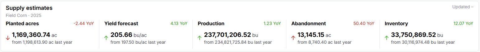 Amount of crop inventory being stored this year as well as last year and the percentage difference between those two numbers